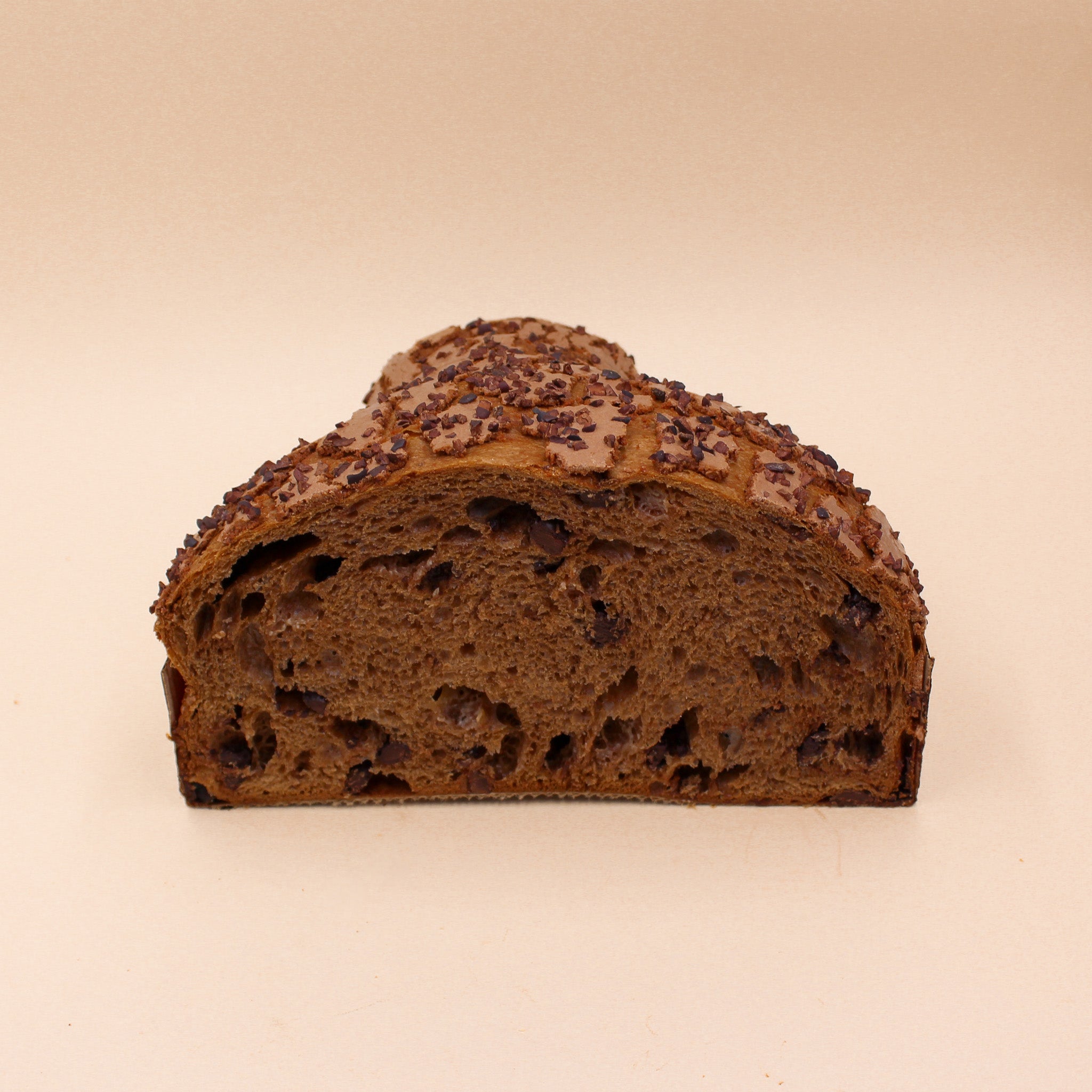 Un croccante guscio glassato al cacao, costellato di grué di cacao, racchiude un impasto leggero in cui il protagonista è il cioccolato, presente in tutte le sue forme. Il cacao amaro e le gocce di cioccolato fondente impreziosiscono il cuore della colomba e ne esaltano il sapore. L’impasto, ottenuto da lievitazione naturale con lievito madre, dona al dolce una consistenza soffice e fragrante.