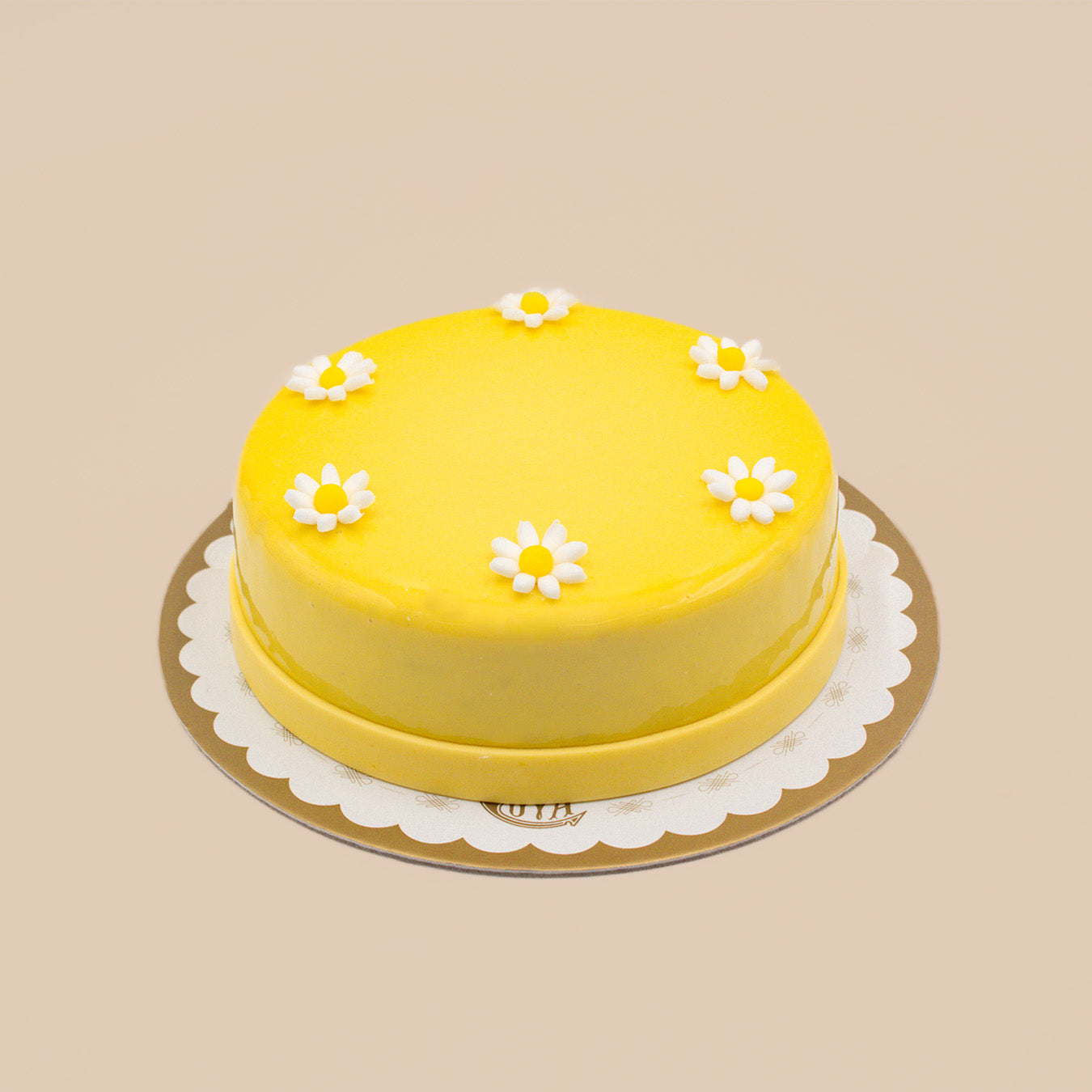 Delicious mango mousse, coated with a delicate glaze and small daisy decorations.
