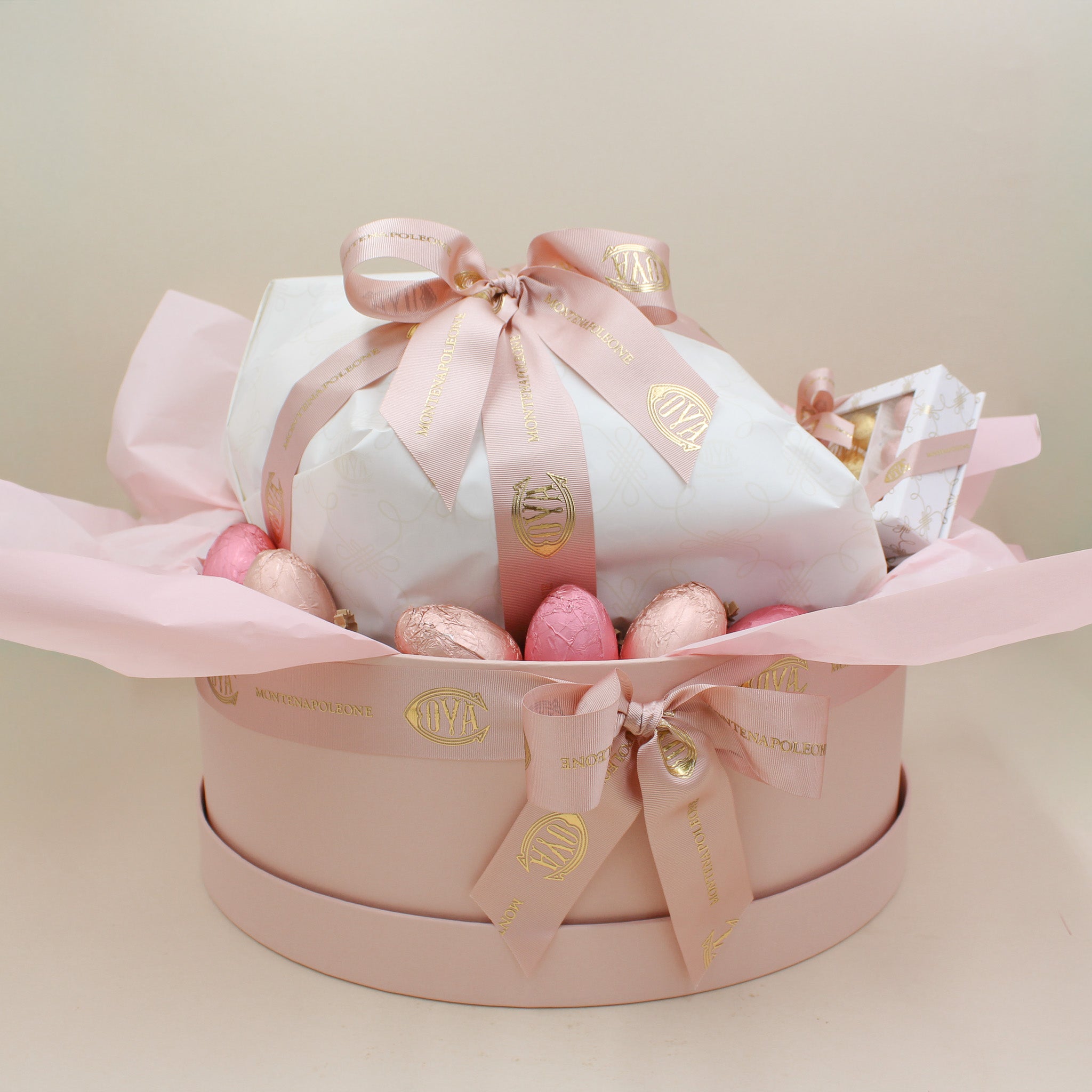 The elegance of refined packaging, the quality of a handcrafted product: a precious package where the colomba takes center stage, with small eggs and chocolate eggs arranged in a crown.